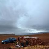 Afloramientos de basalto ricos en ágatas, amatistas y geodas con goethita. Al fondo, el Alto Atlas.