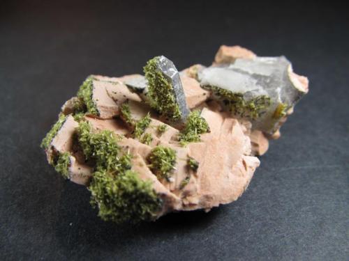 Un cristal de cuarzo ahumado sobre feldespato (probablemente ortosa) con un recubrimiento de pequeños cristales de epidota. (Autor: prcantos)